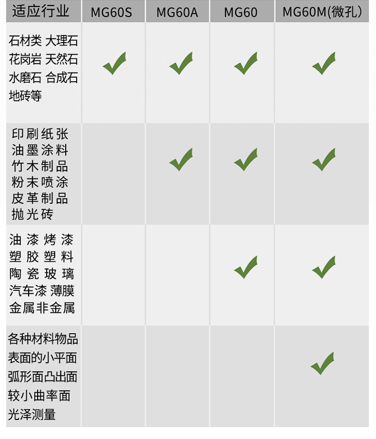 MG60系列光澤度儀分度值分別精確到1-0.1GU,四個規格顏色可選,滿足不同客戶需求;儀器一鍵自動校準,無需手動校準,自動測量讀取數據,無需按鍵操作,使光澤測量變得如此簡單。