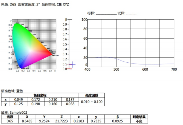 譬如如何判定藍(lán)色試樣是否在《GB/T 18833-2012道路交通反光膜樣》所規(guī)定的藍(lán)色區(qū)域內(nèi)(無金屬鍍層,晝間反光膜顏色),按照下面的步驟,將依次完成測量和判定。