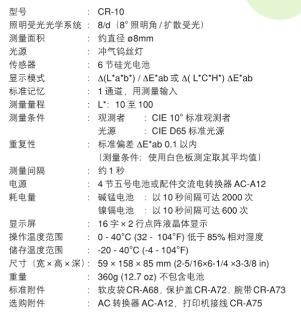 3、日本柯尼卡美能達色差儀CR-10采用8°方向照明擴散受光方式,測量口徑為8mm,適用于各領域應用。
