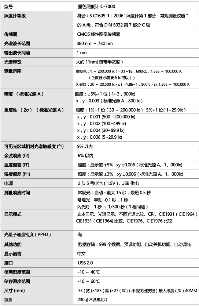 賽科尼可.世光SEKONIC顯色照度計C-7000是一款小巧、易用的光源(包括LED照明和EL照明)測量儀器,可提供CRI顯色指數(shù)、光譜輻射照度、峰值波長、三刺激值、色度、相關色溫、特征波長、色純度、照度以及差值測量的入門級解決方案,顯色照度計C—7000是一款輕便的手持式測量儀器,用于測量光源(包括全新的LED和EL光源)的色彩和照度。測量數(shù)據(jù)是以CRI顯色指數(shù)、三刺激值、照度、色度、特征波長、色純度、相關色溫和與目標的差值形式顯示的,C—7000可搭配另購的閃光同步線進行攝影閃光燈的光譜測量,作為標準配件隨附的實用軟件內(nèi)含了用于數(shù)據(jù)捕捉和分析的更多高級功能。