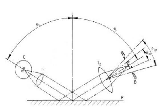 光澤度計的測量原理 ,光源G發射一束光經過透鏡L1到達被測面P,被測面P將光反射到透鏡L2,透鏡L2將光束會聚到位于光欄B處的光電池,光電池進行光電轉換后將電信號送往處理電路進行處理,然后儀器顯示測量結果,光澤度的單位,根據JIS的規定,光澤度的單位為%或者數字即可,此外,記錄時,原則上應明確測定角度測定儀器廠家名型號。